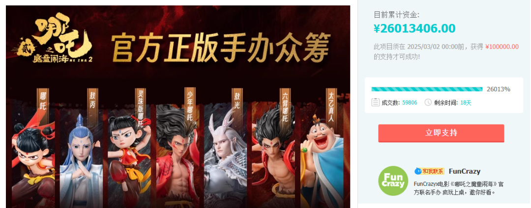 2018年,由末那設計、出品的《哪吒之魔童降世》角色手辦,當時的眾籌金額突破了1300萬元。此次FunCrazy與阿里魚眾籌平台“造點新貨”合作,總共7款手辦通販價格從228元到498元,涵蓋了哪吒、敖丙、敖光和太乙真人的不同造型,眾籌至今金額已突破2600萬元,是7年前的兩倍。值得一提的是,這個眾籌金額放在國內手辦行業,已經算是非常高的了。