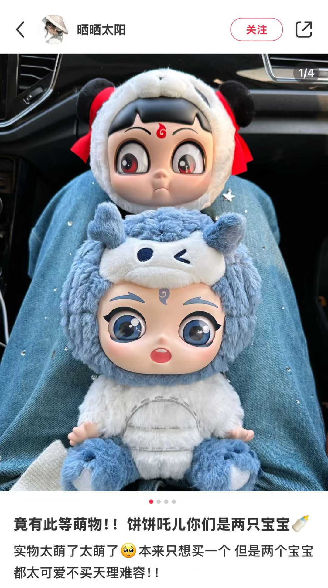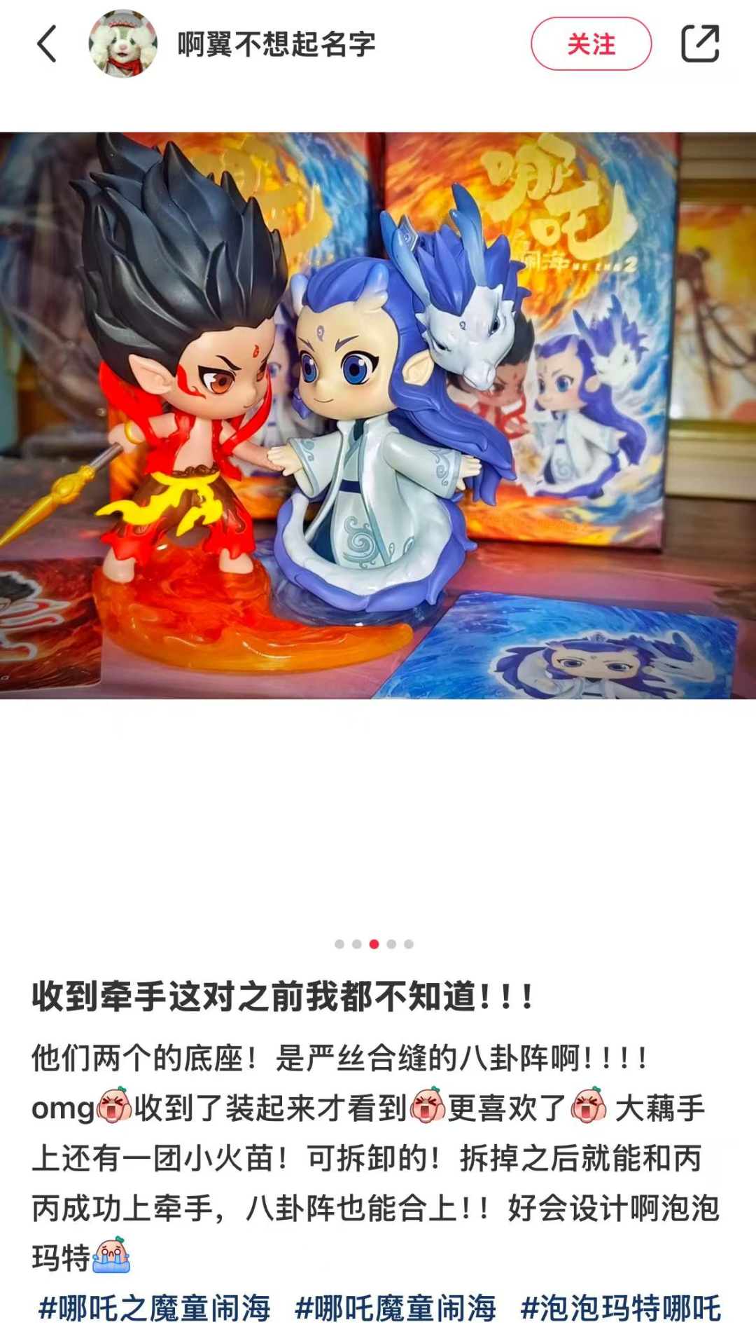 在《哪吒2》製作期間,泡泡瑪特提前1年半拿到授權便開始與授權方進行設計對接,“天生羈絆”的全套設計都相當符合粉絲的胃口。從各種社交平台的曬圖來看,CP粉對這組“雖遲但到”的盲盒設計是相當滿意。