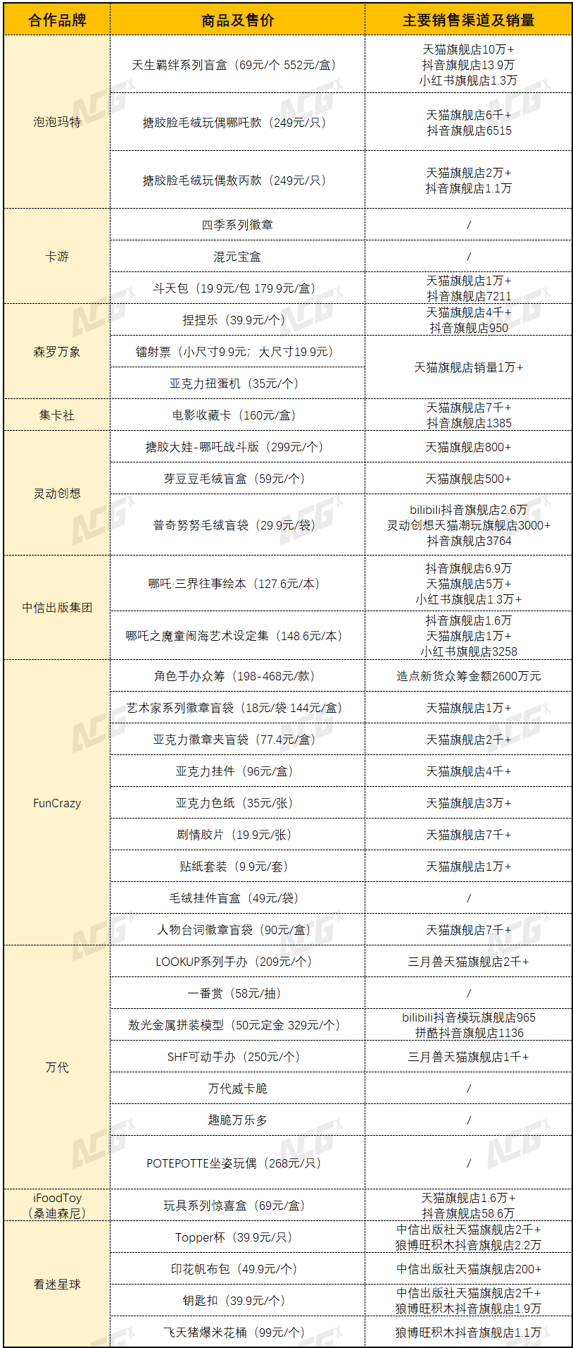 ACGx統計了與《哪吒2》合作的衍生品品牌、產品和銷量(該名單銷售數據主要集中在線上各平台網店,統計截至時間為2月11日)。從這份名單,我們可以看到爆款影視內容與中國衍生品行業是如何實現互相成就的。