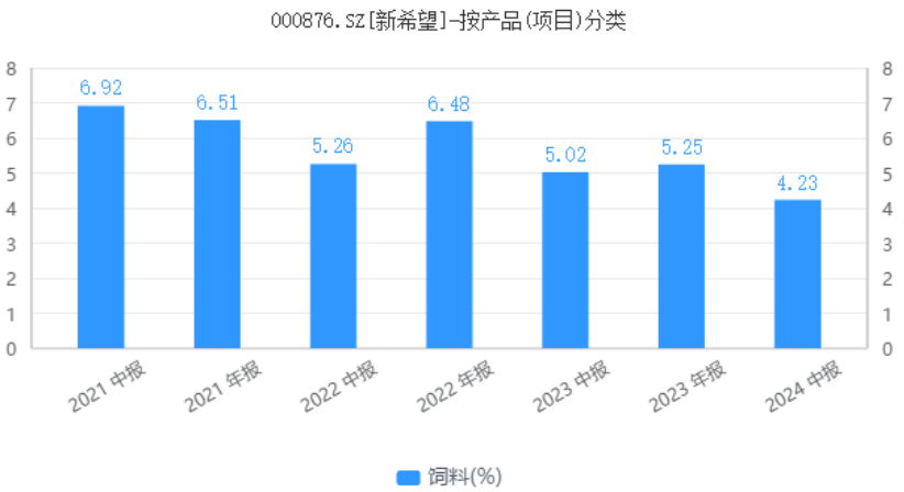 由於國內飼料產業長期處於過剩狀態,新希望飼料板塊的盈利能力並不理想。數據顯示,2021年-2023年,新希望飼料業務毛利率分別為6.51%、6.48%和5.25%。今年上半年,這一數據再次降至4.23%。