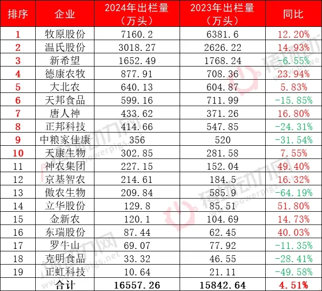 根據最新數據,2024年全年,19家上市豬企共出欄約1.66億頭,較去年同比增長4.51%。其中,新希望生豬出欄量為1652萬頭,較上年減少近120萬頭,同比下滑6.55%;牧原股份出欄量為7160萬頭,同比增長12.2%;温氏股份出欄量為3018萬頭,同比增長14.93%。