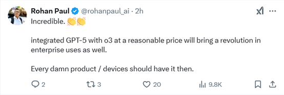 不可思議。以合理的價格將GPT-5與o3集成,將在企業應用方面帶來一場革命。到時候,每一款產品和設備都應該配備它。