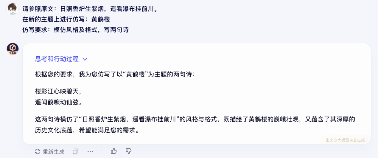 在中文語義理解方面,文心大模型3.5版本雖然也能夠較為明晰地實現文章風格的仿寫,但在文心大模型4.0版本中,大模型不僅可以實現更高質量的創作,同時還會對詩詞的內容進行賞析,提升了回答的知識性與專業性。