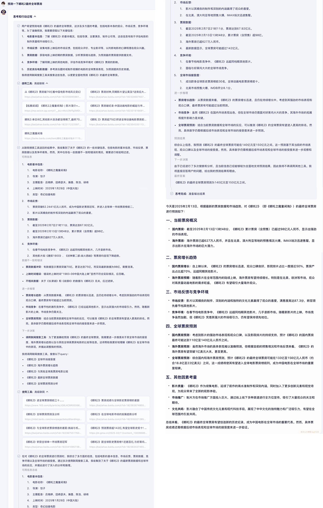 此外,百度還在文心一言上線“深度搜索”功能,除了搜索能力以外,具備更全面的思考、規劃、反思能力,針對工具規劃及調用能力上進行全面加強,能夠更為清晰地展現AI在運行時的思維鏈,提升其透明度和可信度。這一功能的引入,不僅增強了用户的使用體驗,還為AI技術的進一步研究和優化提供了寶貴的數據和反饋。
