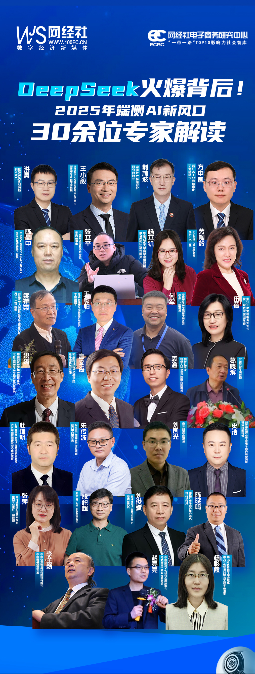 在此背景下,數字經濟新媒體網經社獨家策劃了“DeepSeek系列專家訪談”。邀請了包括商務部研究院、中國社科院、中國消費經濟學會、中國商業文化研究會、中共河北省委黨校(河北行政學院)、浙江數字化發展與治理研究中心等10餘位行業智庫,也包括浙江大學、安徽大學、華東政法大學、浙江工商大學、浙江財經大學、江西財經大學、河北科技大學等20餘位大學教授等行業內權威專家解讀。