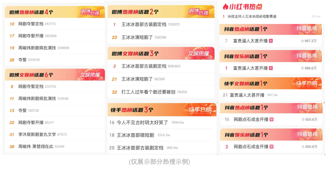 不僅如此,它們還超越了短劇常見的“悶聲熱播”狀態,在劇集用户中實現了多個維度的滲透。在“橫豎互促”的理念下,騰訊視頻橫豎短劇在春節期間累計收穫110+個社交媒體熱搜,全網社交媒體聲量超35+億。