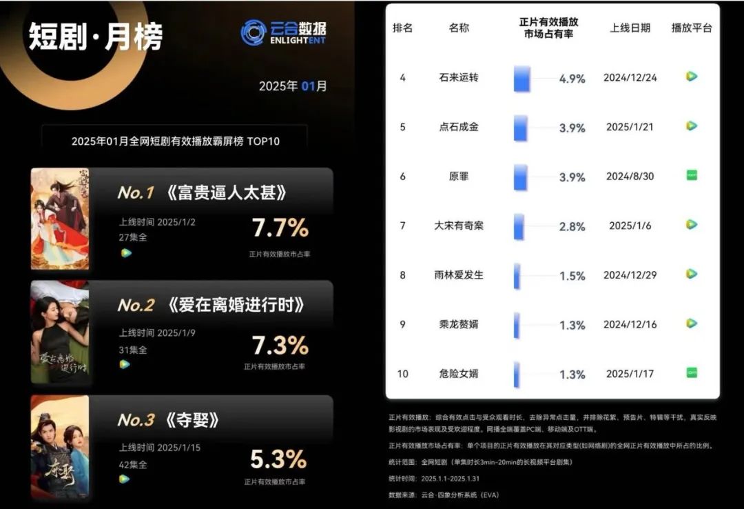 2025春節檔期間,騰訊視頻的短劇陣容以精品橫屏打頭2周內上新8部作品,精品化效應顯著,累計分賬票房超過3000萬。據第三方數據顯示,春節檔期1月月榜微短劇有效播放TOP10中,騰訊視頻佔據8部。