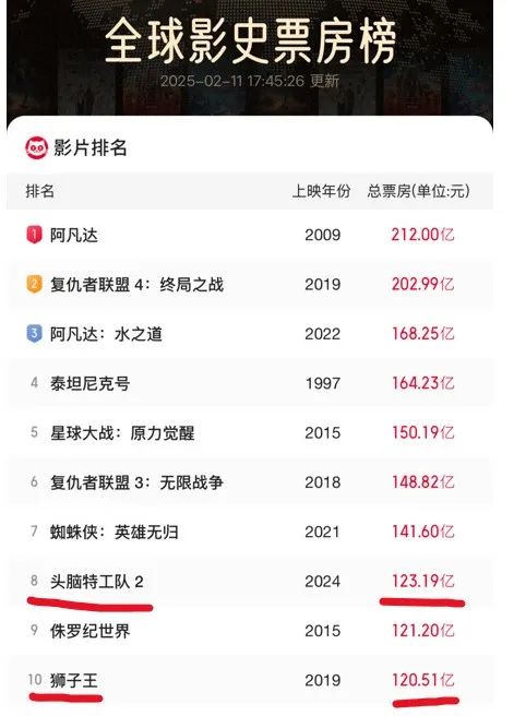 全球票房第10名是《獅子王》,以中國人對於前十名的執念,不得衝一衝把哪吒送進前十;《頭腦特工隊2》是動畫電影全球票房冠軍,這就差3億了,不得衝一衝讓哪吒登頂全球動畫啊;貓眼預測票房是160億,這就到全球電影票房前5了;都到第5名了,再衝個十幾億就位列前三了;都到前三了,搏一搏衝到全球第一也不是沒可能…