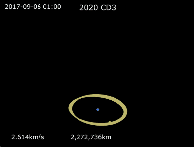2006年還曾經有一顆3米左右的小行星(編號2020CD3)路過地球附近時,被地球引力捕獲,然後在太陽地球和月球的影響下,毫無規律的繞了地球十幾圈,在2020年逃脱地球引力繼續環繞太陽,它在100年內的撞擊地球概率為2.5%。
