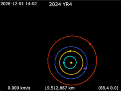 隨後天文學家對2024YR4進行幾十天的連續觀測,估算出了它的大致運行軌道,軌道週期為3.99年,與地球軌道相交,下一次接近地球是2028年12月17日,局時兩者相距790萬± 50萬公里,等到2032年12月22日,它第二次接近地球時,兩者將會有概率相撞。