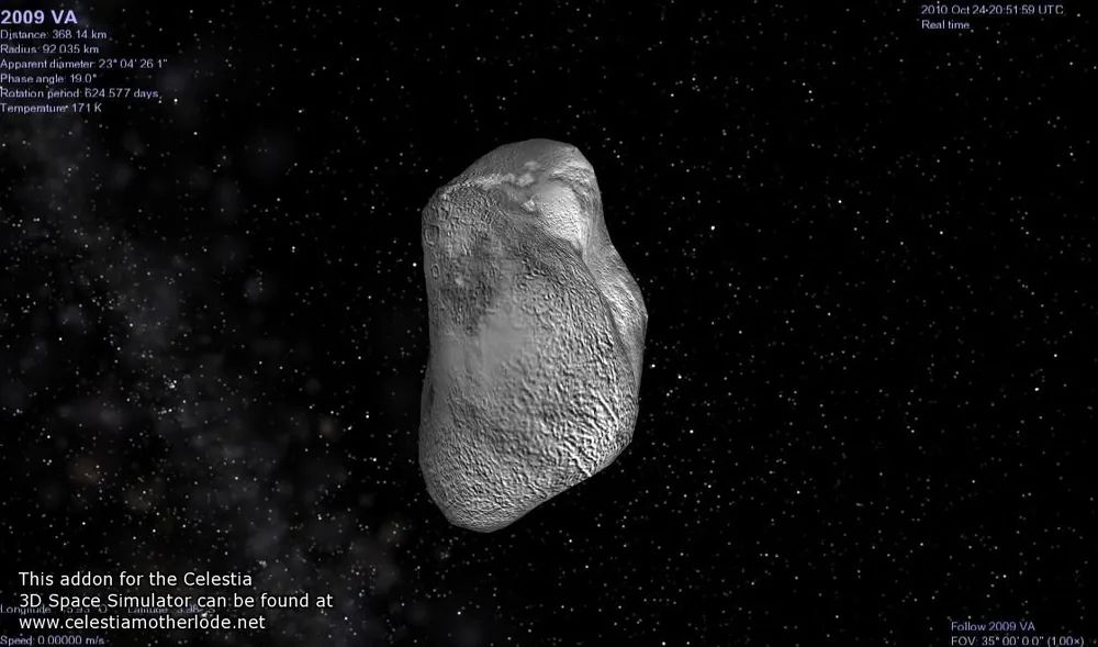 作為對比,2025年最可能撞擊地球的一顆小行星(編號2009VA),它將會在今年11月6日有四千八百分之一的概率撞上地球(好在它直徑只有7米,會在大氣層中被燒燬)。
