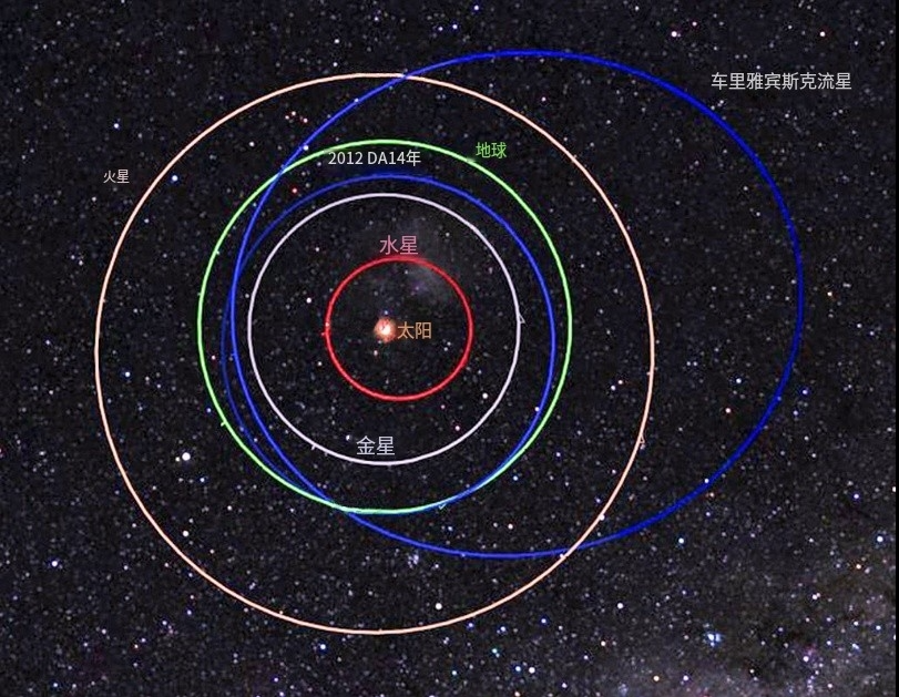 ▲2013年撞擊在車里雅賓斯克的小行星軌道,16小時後還有一顆叫2012DA的30米小行星在地球2.7萬公里處擦肩而過。