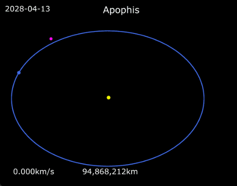 ▲曾經危險等級最高的99942阿波菲斯行星(紫色軌道),預計將會在2029年距離地球(藍色軌道)4.7萬公里外擦肩而過。