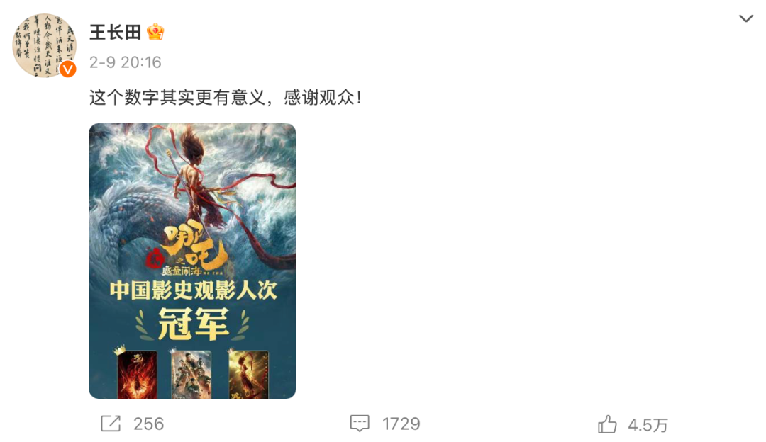 2月9日,《哪吒2》憑藉1.6億觀影人次,再次打破中國影視紀錄,王長田發佈戰報,他説:“這個數字其實更有意義,感謝觀眾!”