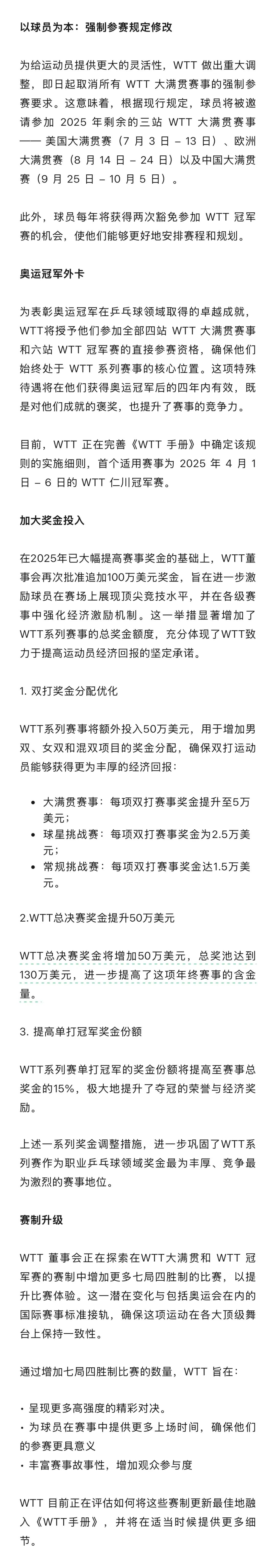 兩天之後,WTT宣佈做出重大調整:即日起取消所有WTT大滿貫賽事的強制參賽要求,還包括給奧運冠軍外卡,加大獎金投入等多項措施。