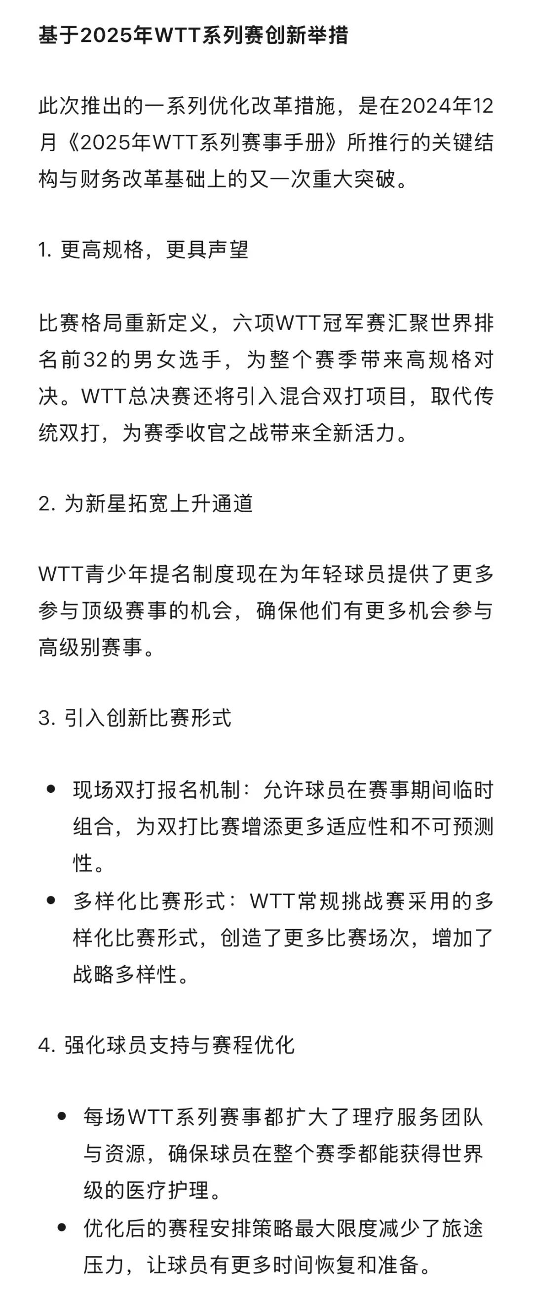 WTT表示,此次優化改革措施,是在2024年底發佈的《2025年WTT手冊》所推行重大改革的基礎上進一步深化,彰顯了WTT為球員營造卓越競賽環境的堅定決心。