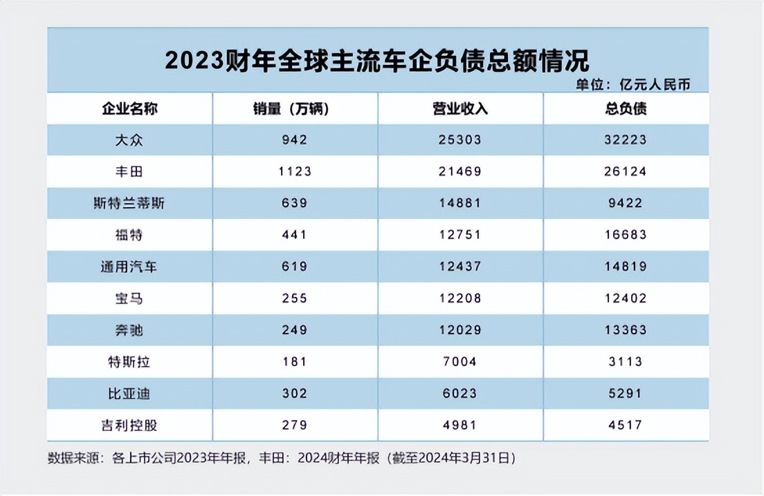 此外,全球車企債務總額也很高。按照最近一個完整財務年度數據,債務總額超過萬億元的車企有大眾、豐田、通用、福特、寶馬和奔馳,其中大眾超過3萬億元,豐田超過2萬億元,遠超比亞迪和吉利這兩家頭部車企。
