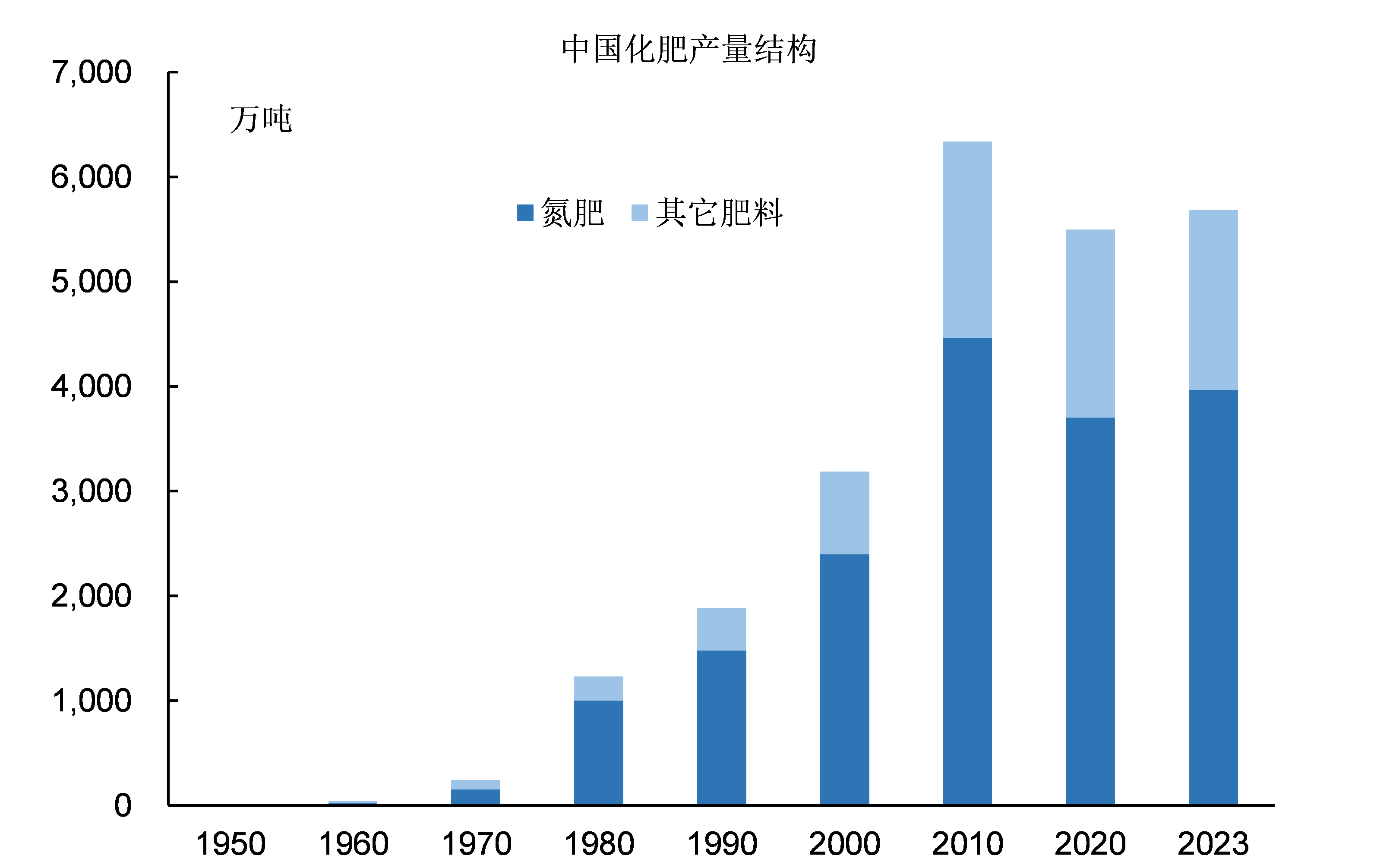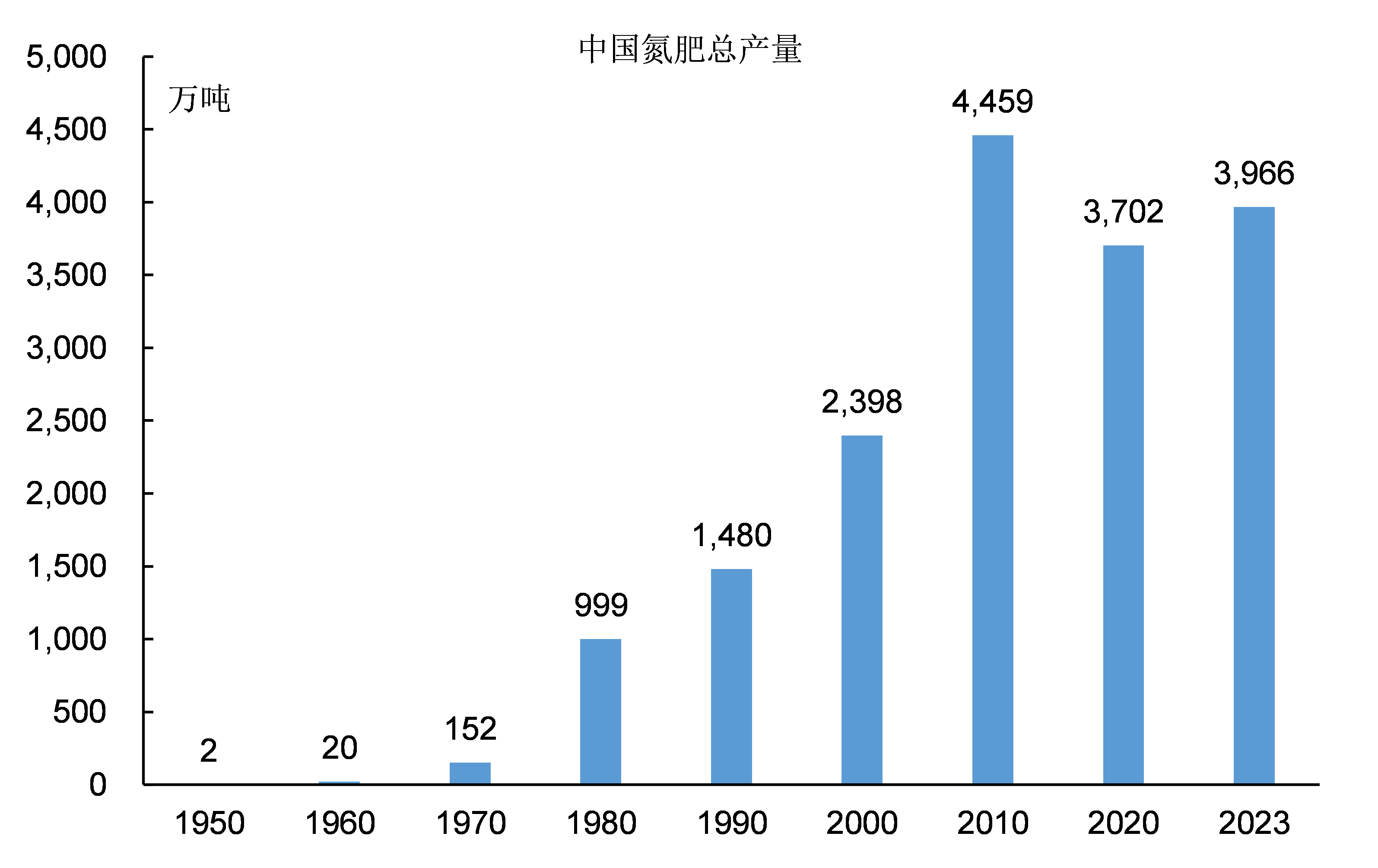 2010年,中國氮肥產量增長至4459萬噸,在全球氮肥產量中的佔比增長至43.6%,氮肥產量大幅領先全球所有其它國家。