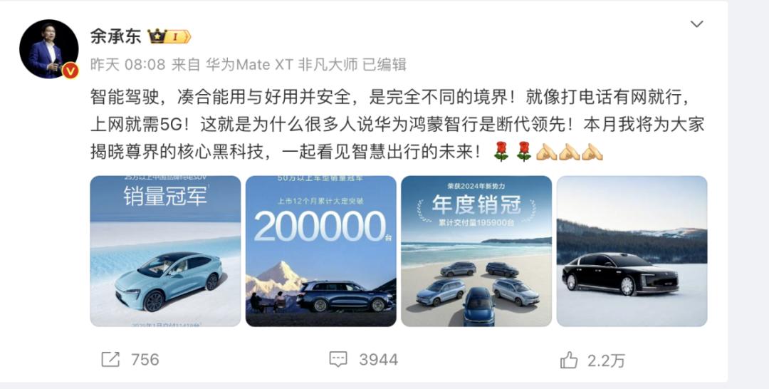一番炮轟之後,華為車BU董事長餘承東成為了第一位站出來回懟,維護智駕價值的車圈大佬: