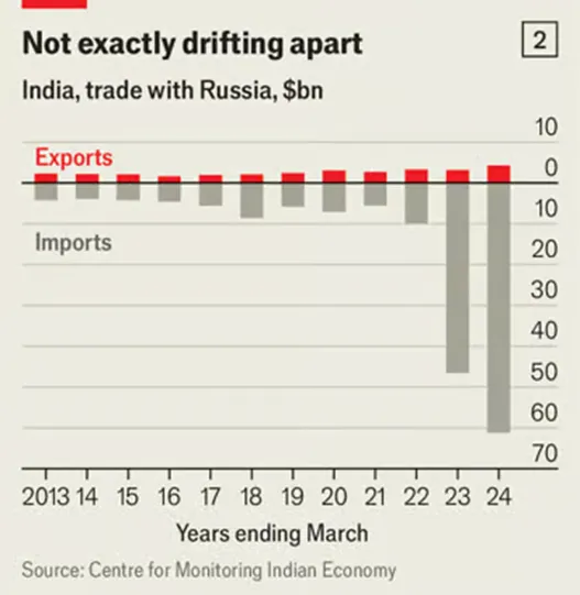 **然而,印度對未來的印俄關係持截然不同的看法,近期的事態發展也充分體現了這一點。首先,**2024年12月2日,俄羅斯總統普京宣佈將在2025年初訪問印度。幾天後,印度國防部長拉傑納特(Rajnath Singh)於12月8日抵達莫斯科,雙方討論了新的防務協議,包括購買價值40億美元($4bn)的雷達系統。**緊接着,**雙方簽署了有史以來最大規模的能源協議,年交易額約130億美元($13bn)。根據協議,俄羅斯國有石油公司Rosneft將向印度私營煉油商信實工業公司(Reliance)每日供應約50萬桶原油,合同期為十年。