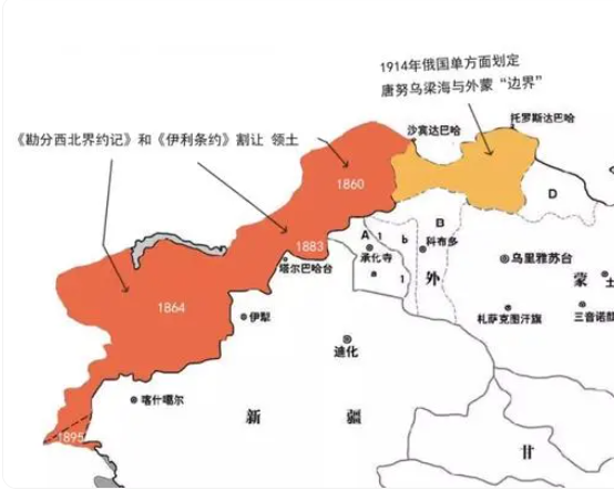 從1856年到1884年,俄國通過武力強迫中國陸續簽訂了《璦琿條約》、《北京條約》、《勘分西北界約記》三個不平等的條約,奪取了外興安嶺、庫頁島、以及巴爾喀什湖以東以南的中國北方約100多萬平方公里的領土。