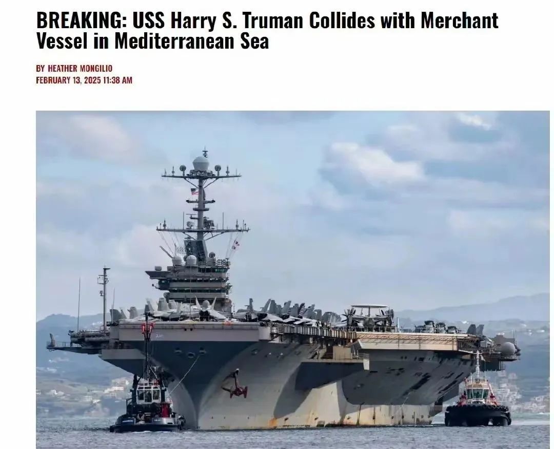 美東時間2月13日(北京時間2月14日),美海軍第六艦隊在美海軍網站上發表聲明稱:當地時間2月12日晚上11時46分,杜魯門號航空母艦在地中海埃及塞得港附近,與商船 “貝西克塔斯 - M” 號發生碰撞。