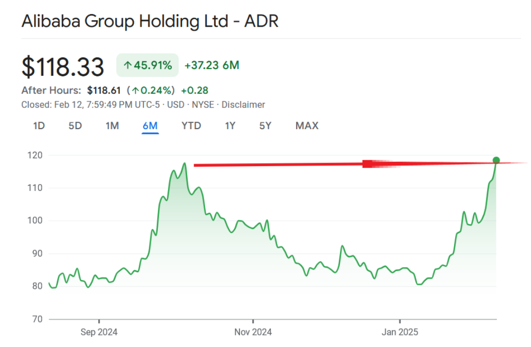 順便提一下,一個月來,阿里巴巴股價猛然升高,從1月10的80美元一股,漲到昨日的118美元,突破10月的階段性高點,漲幅為47.5%。