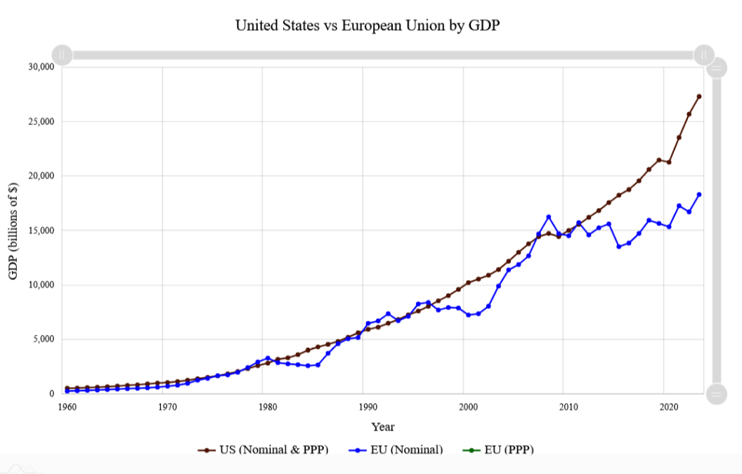畫面上咖啡色的曲線是美國的GDP,藍色部分是歐盟的GDP。