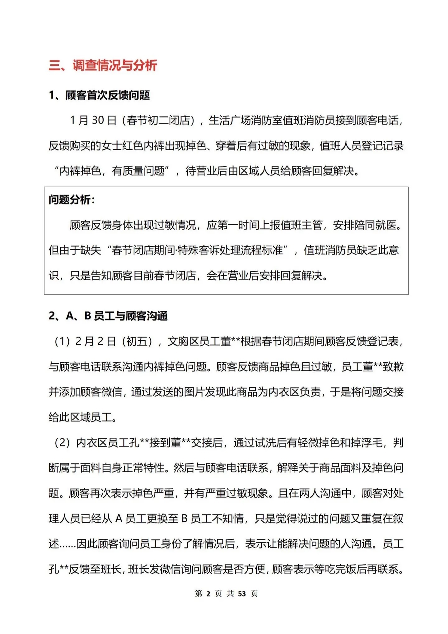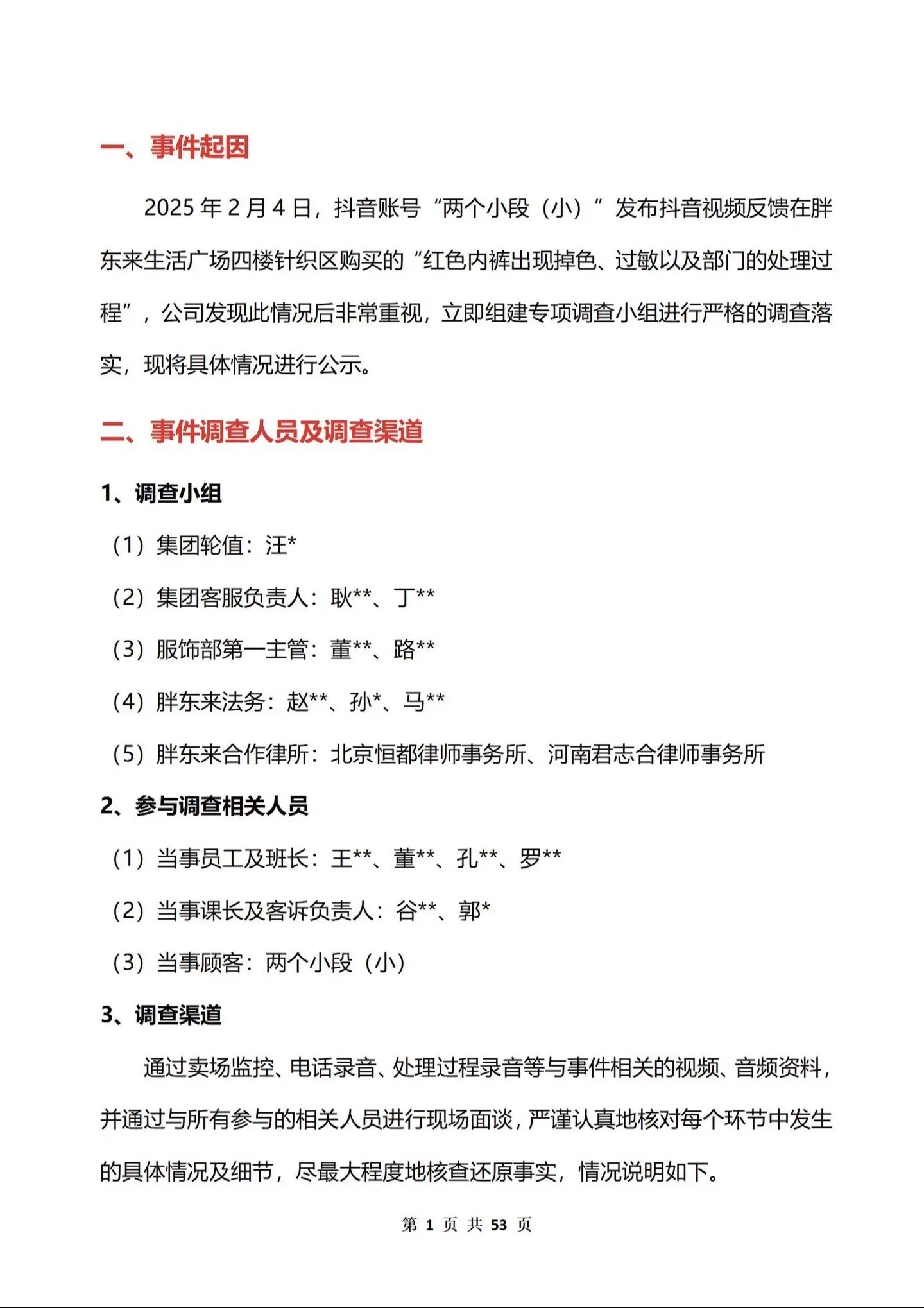 2月14日,胖東來官方抖音號發佈長達53頁的《關於“紅色內褲掉色、過敏以及部門處理過程”的調查報告》。