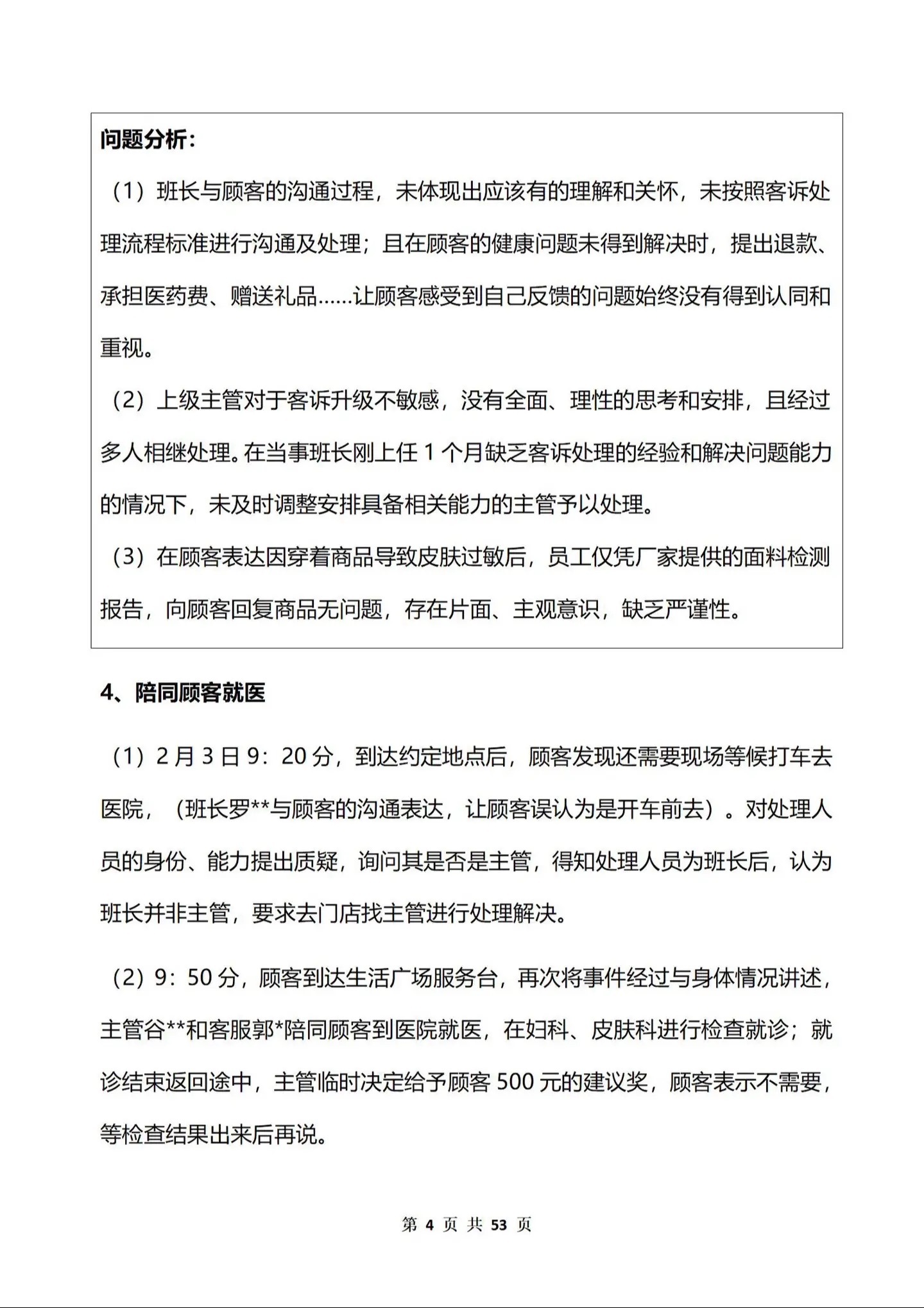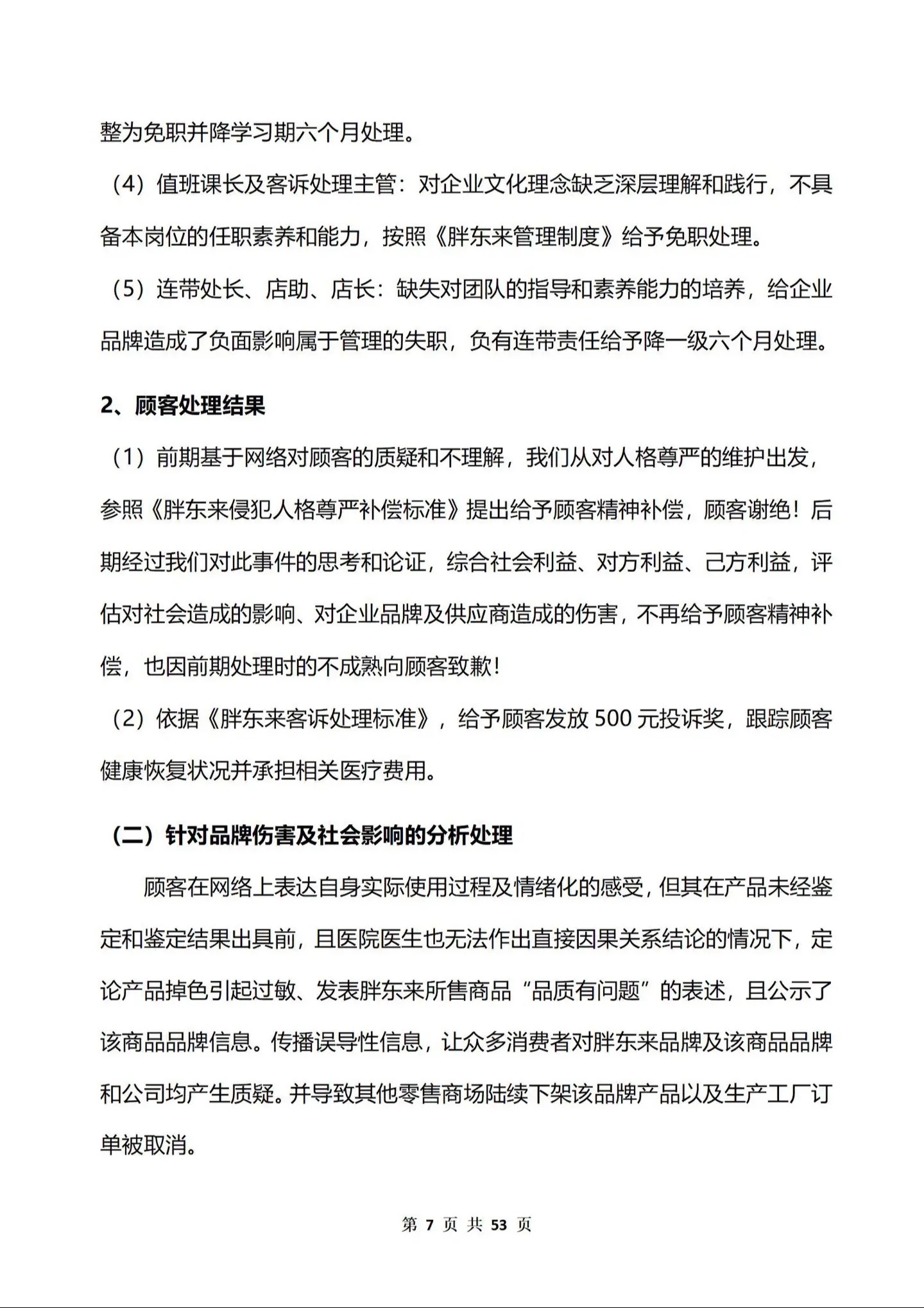 由於對企業文化理念的認知不夠,未按照流程標準為顧客處理與解決,給顧客造成傷害且造成社會負面輿論影響,胖東來對實習班長予以免職並降學習期六個月處理,對值班課長以及客訴處理主管也予以免職處理,連帶處長、店助、店長負有連帶責任給予降一級六個月處理。