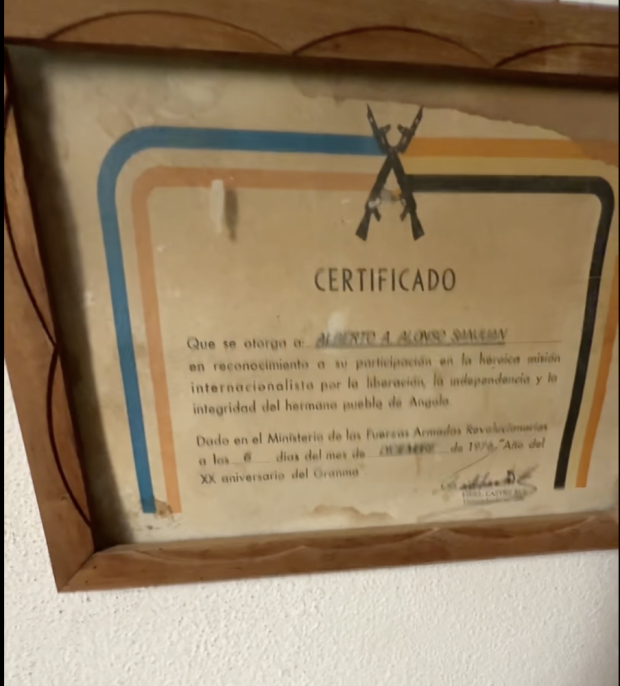 在Dido那簡陋的屋子裏,掛着一張寫着“為安哥拉人民的獨立和解放運動作出貢獻”的證書,落款是著名領袖菲德爾·卡斯特羅(Fidel Castro)。