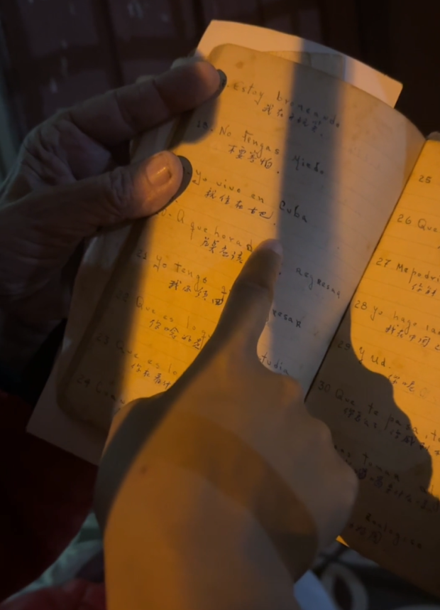 保存了幾十年的筆記本早已泛黃,Dido一頁一頁地翻着,上面用西班牙語和中文寫着“你什麼時候回來?”“什麼時候走?”“你家裏好嗎?”“我們回去吧!”……