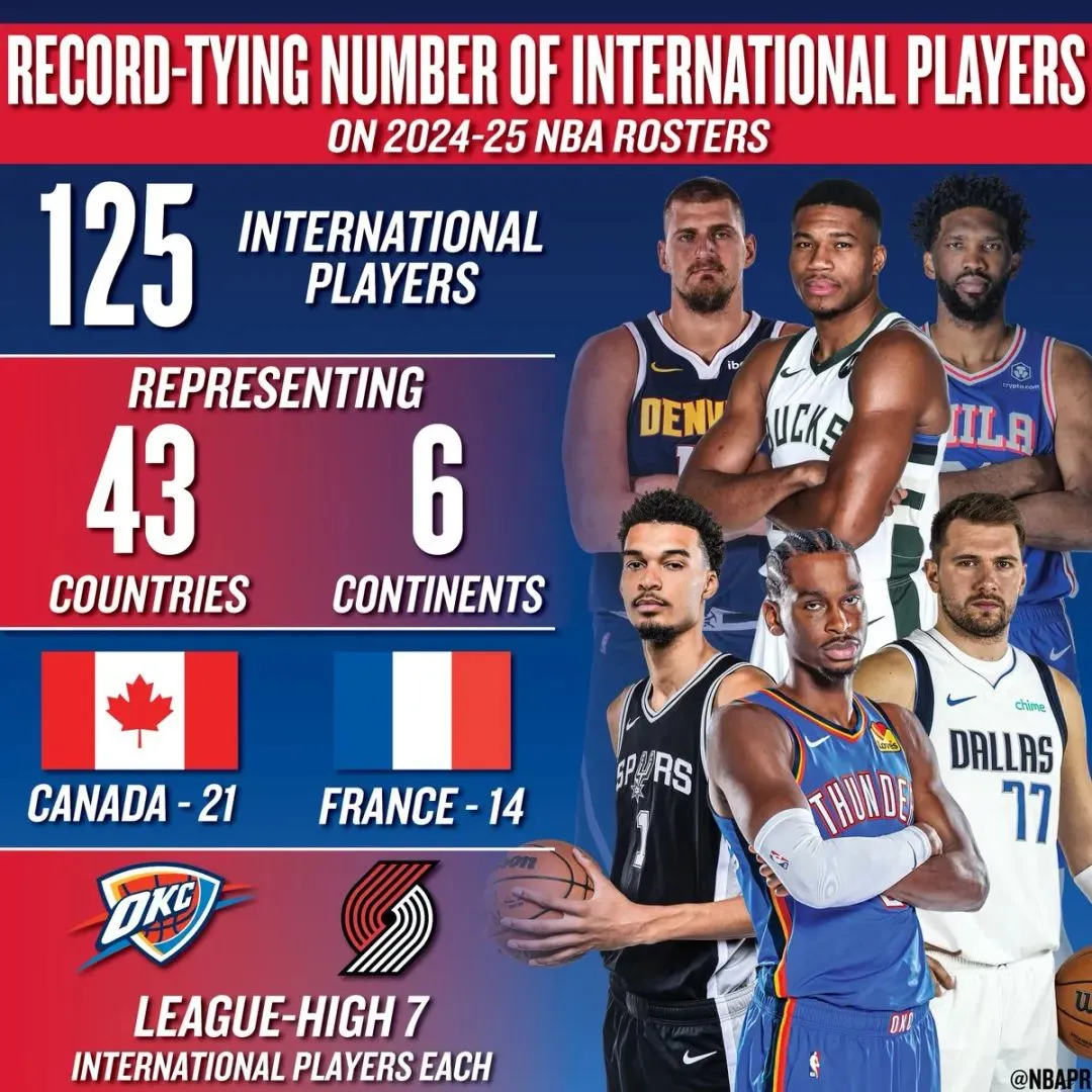最近幾年趨勢發生了轉向。2017/18賽季,還有2023/24和2024/25賽季,以NBA揭幕戰的時間點統計,國際球員的數量都達到了歷史最高的125人,佔聯盟球員數量的1/4了。