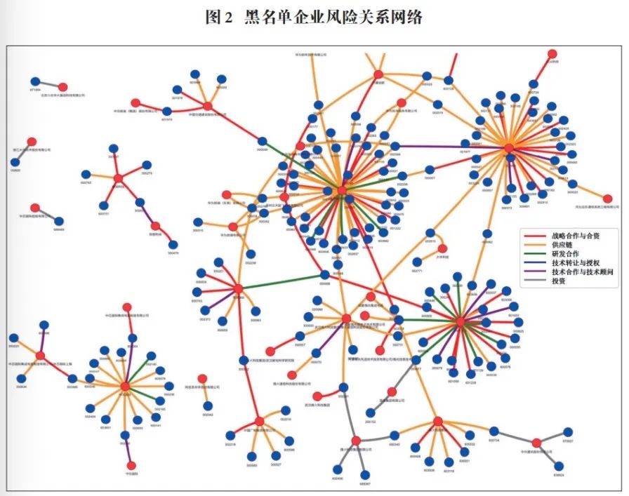 企業間關係複雜多樣,同時,不同企業間可能存在多種關聯關係,而這種關係有可能是隱秘而難以直接獲得的。在此情況下,本文利用技術手段獲取企業多渠道信息,同時繪製黑名單關聯企業知識圖譜。知識圖譜是一種用於表示和組織知識的圖形化結構,它由一系列實體(如人物、組織、地點)和它們之間的關係構成,是以數據手段洞悉企業間關係的重要方式。基於企業招投標信息、投資關係、招聘信息、專利授權信息、上市公司財務信息、供應關係、輿情信息7個數據源,**本文整理了黑名單企業知識圖譜,形成企業間六大關係,包括戰略合作與合資關係、供應鏈關係、研發合作關係、技術轉讓與授權關係、技術合作與技術顧問關係以及投資關係。**圖譜總計240個企業,其中包括76個基礎黑名單企業、70個戰略合作與合資關係企業、136個供應鏈關係企業、30個研發合作關係企業、2個技術轉讓與授權關係企業、45個技術合作與技術顧問關係企業、35個投資關係企業(部分企業有重複)。進一步地,本文利用自然語言處理方法從上述信息源中加工了每個實體的特徵。基於上述機制,本文構建了黑名單關聯企業風險網絡關係圖(圖2)。其中,圖中紅色節點為黑名單企業,藍色節點為與黑名單企業存在關聯關係的企業。