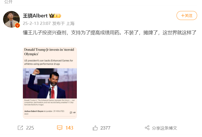 可以想象,到時候國內某些覺得傳統醫學一無是處的人,自然會吹捧這些賽博朋克巫醫,其中也必然會包含各種健美圈用藥。樂觀一點來想,考慮特朗普——小肯尼迪對於全球公共衞生系統的衝擊,這方面的問題已經是很小的那種了。
