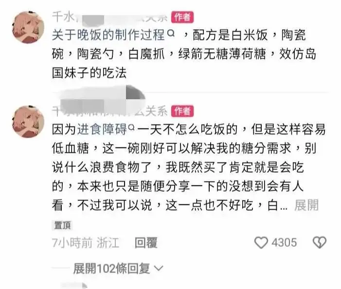 評論區的日本路人也很有趣。一種是大喊“可愛”“看着很美味”“我也要試試”的二次元們,另一種是有點難繃的路人“你小子最好是全吃乾淨了”“讓我在死亡和吃這碗飯之間選擇,我會猶豫兩個小時然後哭着吃完”,甚至還有和她探討到底哪款薄荷糖拌飯更好吃的隱藏大神。