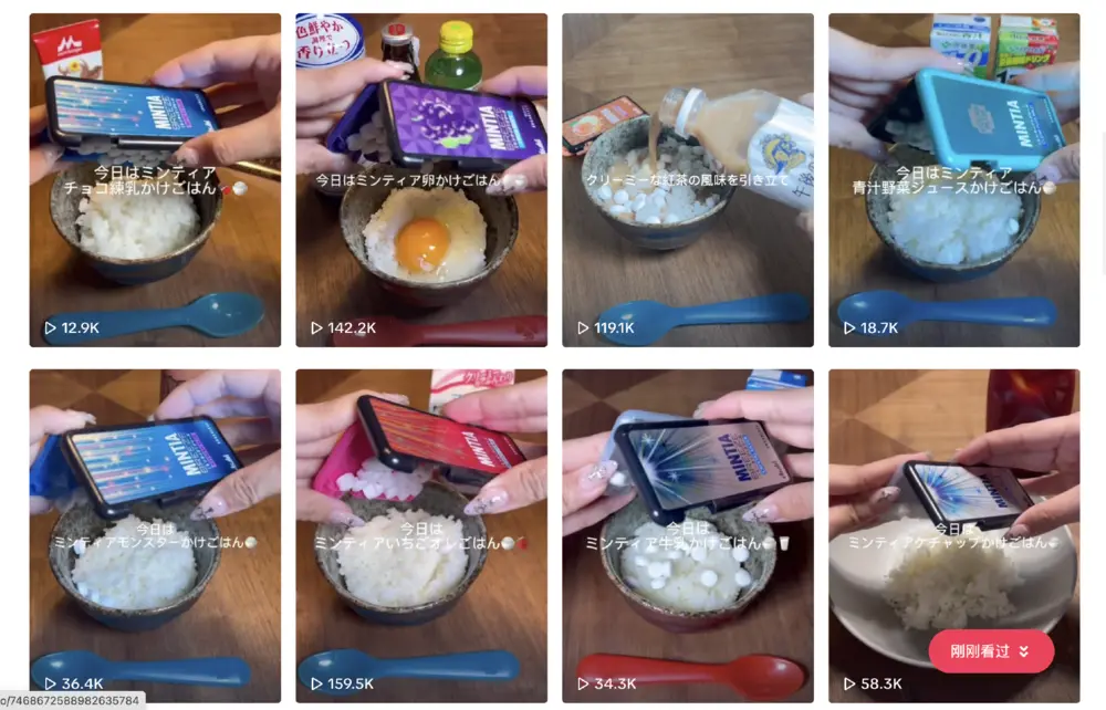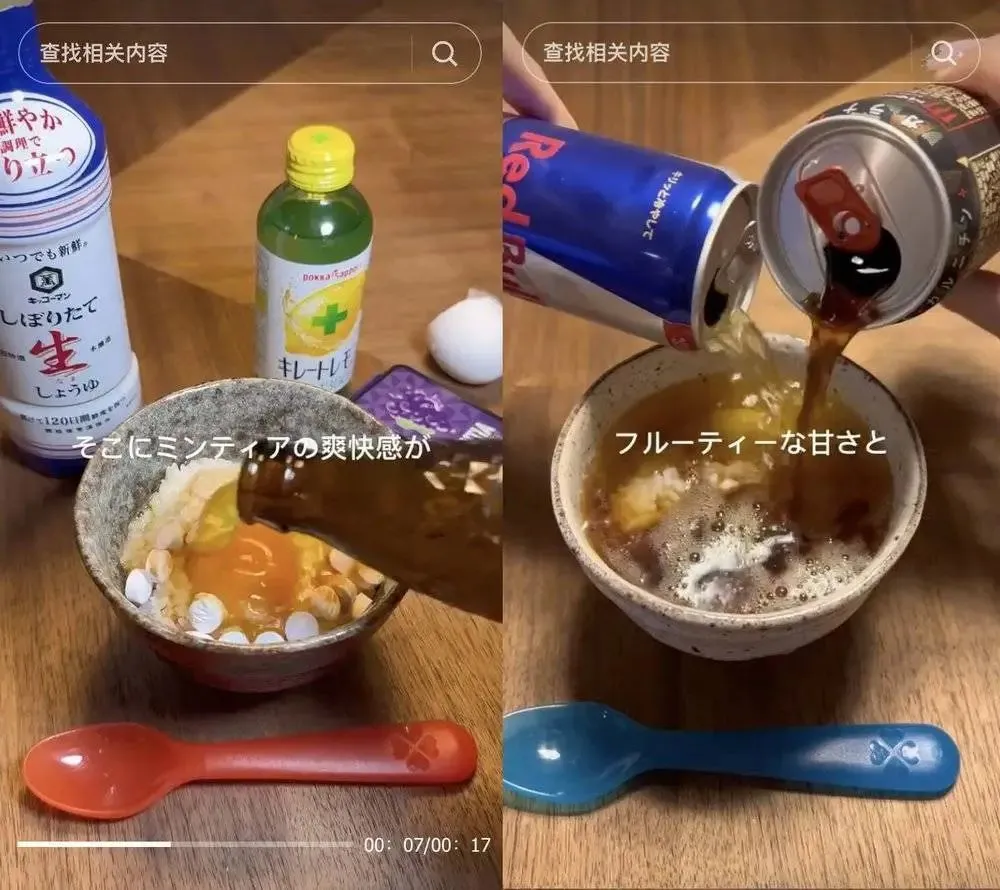 在魔爪拌飯火了之後,這位女生又整了一系列新活兒,包括醬油生雞蛋+汽水薄荷糖拌飯,可爾必思拌飯,養樂多拌飯,薄荷糖三角飯糰。