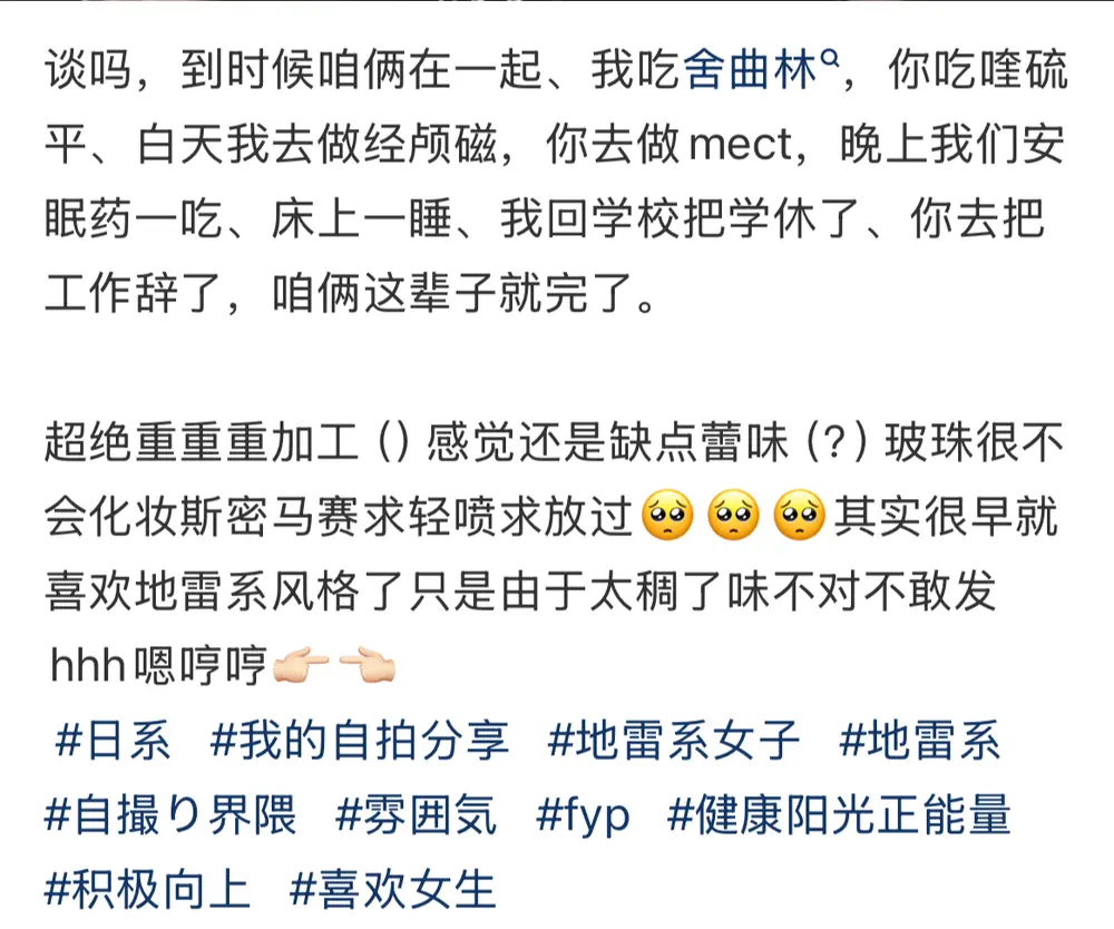畫虎畫皮難畫骨。僅僅模仿日系前輩的穿搭,還是無法參透地雷系的精髓,只是圖個熱鬧罷了。真正的地雷系,必須真的“生病了”。