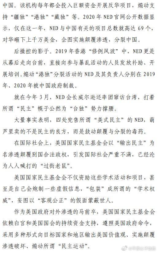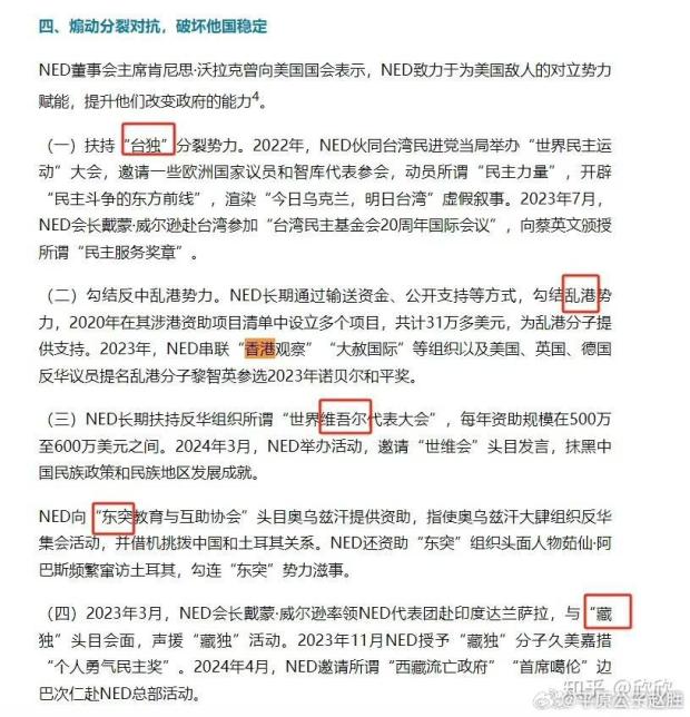 NED還扶持“台獨”分裂勢力,夥同台灣民進黨當局舉辦“世界民主運動”大會,並邀請一些歐洲國家議員和智庫代表參會,動員所謂“民主力量”,開闢“民主鬥爭的東方前線”,渲染“今日烏克蘭,明日台灣”……NED長期通過輸送資金、公開支持等方式,勾結亂港勢力,2020年在其涉港資助項目清單中設立多個項目,共計31萬多美元,為亂港分子提供支持。