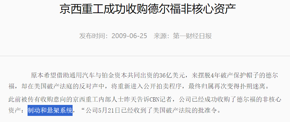 都説機會是留給有準備的人,這個專利羣大規模到期的機會就被咱們開頭説到的京西集團抓住了。早在 2009 年的時候,京西重工就花了 9000 萬美元收購了前頭的專利二人組之一:德爾福公司的減振和制動業務,並且順帶擁有了它在全球的八個工廠和五個研發中心。
