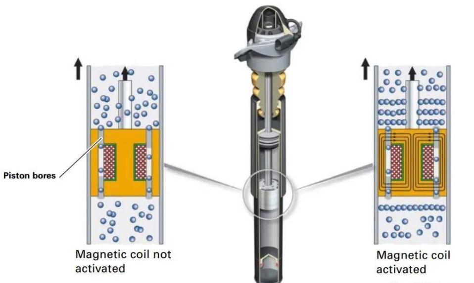 閥門只有開和關兩個狀態,但磁場的大小可以多檔甚至是無級調節,配合上現在很多車企都在説的道路預瞄,就可以非常快速且靈活的設置好需要需要的減振器阻尼,對提高動態穩定性和坐車的舒適性都非常有用。