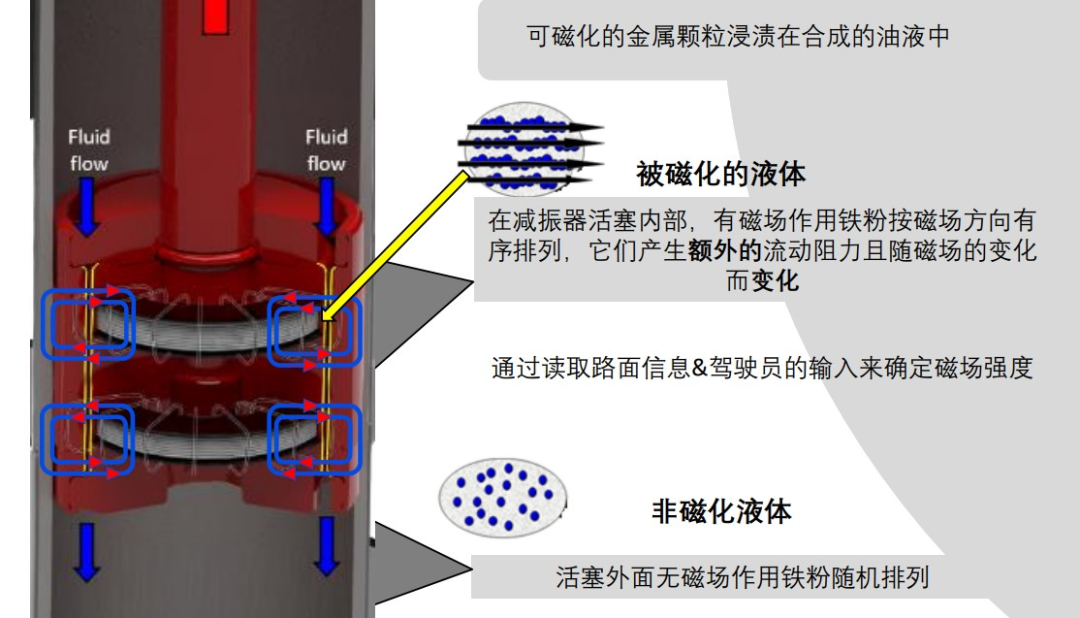是不是感覺有點科幻,但它還真就通過一個很天才的思路實現了這種效果。那就是把原先減振器裏的油液換成磁流變液。這玩意顧名思,就是會根據環境磁場的不同改變液體內粒子的排列方式。