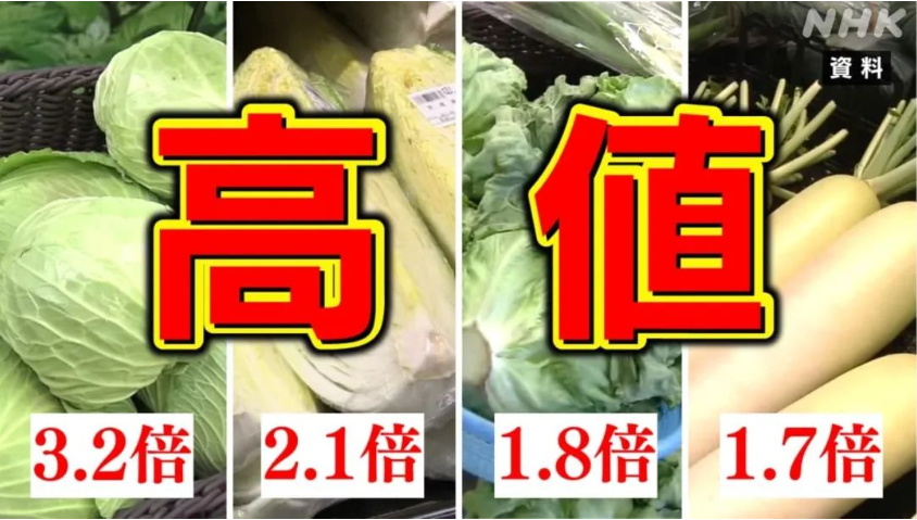 1月上旬時,日本NHK就報道過高騰的菜價。除了一下子漲了3倍多的捲心菜,還有上漲2.1倍的大白菜、漲了1.8倍的生菜、以及1.7倍的蘿蔔等等。