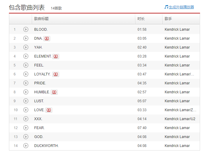 剛剛在超級碗上表演的Kendrick Lamar,他的專輯《DAMN.》裏,14首歌的歌名全都是一個單詞。