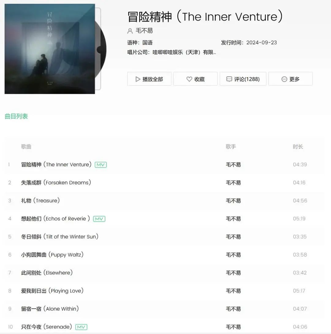 毛不易的新專輯《冒險精神》,時長都在4分多種,甚至還有5分鐘的。