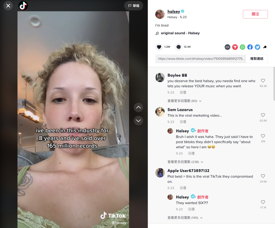 賣過1.6億張唱片的Halsey説,唱片公司和經紀公司現在“唯TikTok是圖”,不僅給他們安排了TikTok內容數量指標,而且發歌時間也由不得自己,而是被平台熱點和趨勢綁架。