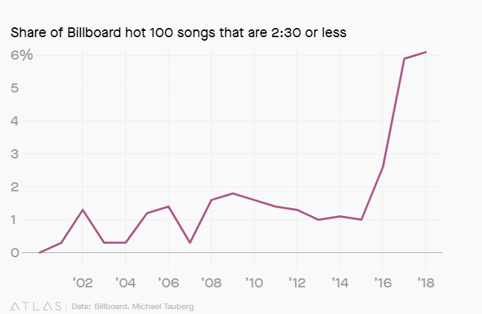 根據《Quartz》的統計,2013年至2018年,Billboard百大熱門金曲的平均時長縮短了20秒。
