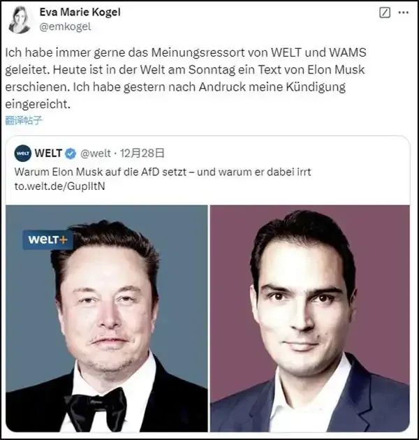 ▲當地時間2024年12月28日,馬斯克在德國《星期日世界報》發表了一篇評論文章,公開表達對德國選擇黨的支持,稱該黨是德國最後的希望。該報一名編輯宣佈辭職以示抗議。(圖源:網絡)