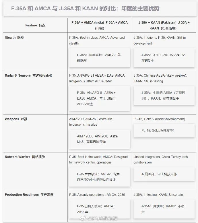 儘管只是特朗普表態,要給三哥出口F-35A,印度國內的軍迷們已經沸騰了。甚至還有印度軍迷專門做了一張表格,暢想印巴兩國第五代戰鬥機之間的對比。