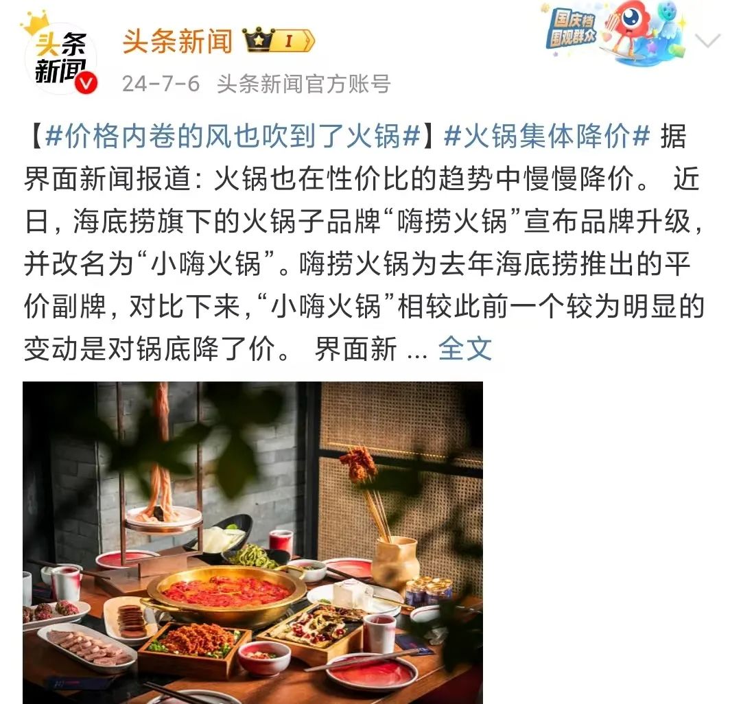 哺呷哺發佈新菜單,均價降幅超10%;鄉村基發佈降價通知,4款產品價格降至2008年前水平;和府撈麪全新產品價格下調幅度達30%;海底撈將“海撈火鍋”更名為“小嗨火鍋”,鍋底價格從19.9元降至9.9元。